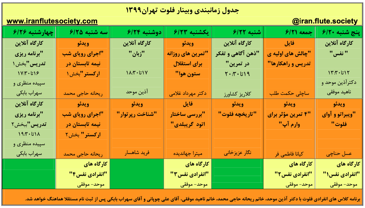 - مابقی کلاس ها که به رنگ نارنجی نمایش داده شده اند به طور روزانه در صفحه وبینار در وبسایت انجمن فلوت ایران (همین صفحه) بروز رسانی می گردد. ورود